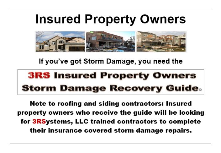 For the benefit of millions of insured commercial and residential property owners from across the USA and Canada, 3RSystems, LLC is now sending our FREE 3RS Insured Property Owners Storm Damage Recovery Guide© to them, en masse. The guide is also now available for FREE to the thousands of property damage restoration contractors from across the country that specialize in insurance covered storm damage restorations. The guide is being sent directly to property owners and offered to them and to restoration contractors through this site. Through this detailed and comprehensive insured consumer focused insurance claims recovery process guide, insured property owners will become the best informed property owners in the country in regards to how best handle their insured property damage claims and, along with their 3RSystems, LLC trained storm damage restoration contractors, hold their insurance company adjusters and engineers accountable when they attempt to underpay or deny their legitimate property damage claims.