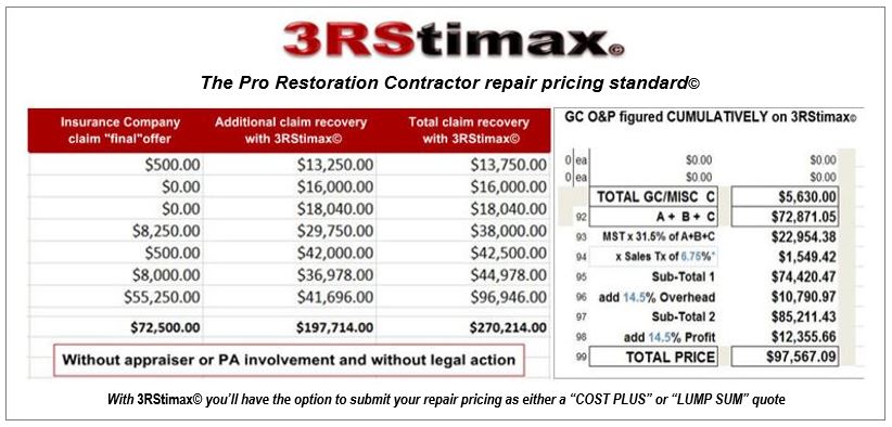 After completing the training and switching from the so-called "industry standard" low ball and forced market priced repair estimating programs known as Xactimate or Symbility, as can clearly be seen in the graph shown to the left, on just the seven insurance restoration projects shown, as a result of using our 3RStimax© contractor favored free market real, true, and accurate (RTA) priced property damage repair estimating program, the final pricing amounted to an additional $197,714 in legitimate claim payments to the insured property owners.