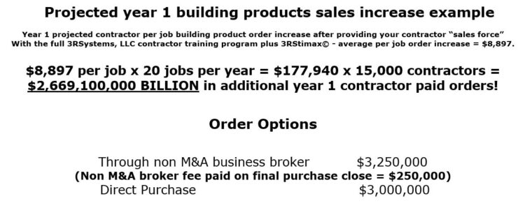 The building products manufacturer or distributor who makes 3RSystems, LLC restoration contractor training available to all of their restoration contractor sales force across the country will, as shown below, advance their company product sales to record levels, take a #1 top level position in the building products industry, and achieve true maximum ROI for themselves and their investors.