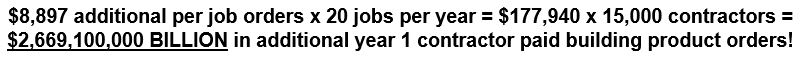 Year 1 projected contractor per job building product order increase after providing your valued contractor “sales force” with 3RSystems, LLC contractor training program plus 3RStimax©, and 3RS Insured Property Owners Storm Damage Recovery Guide© = $8,897.