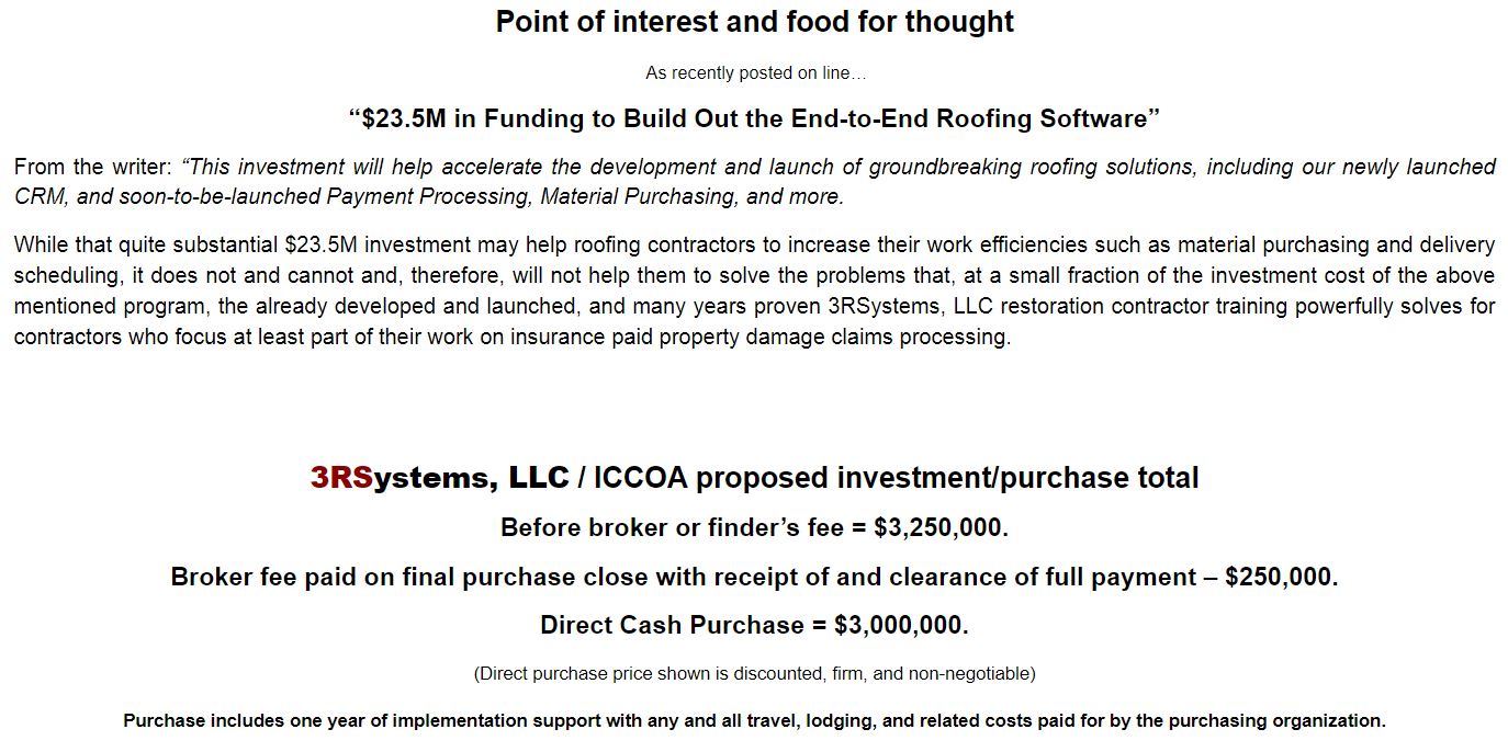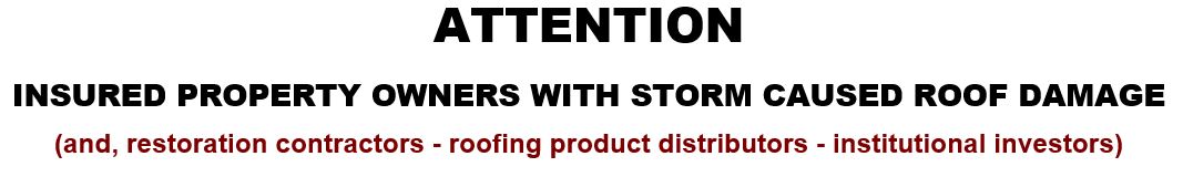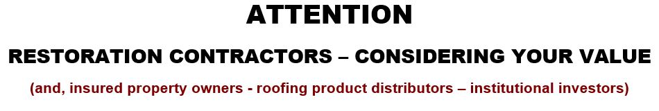 Not considering the above reality, rather than investing the relatively small amount of money needed to provide advanced training to their contractor "sales force" en masse which would result in a dramatic increase in sales of their building products to the ultimate buyers of those products, they instead operate under the assumption that, as long as the contractors keep ordering their products, there is no good reason to invest in getting available advanced and proven storm damage restoration process training into their hands. I suspect however, that as the investors in such companies become more educated on the subject matter as they now are as a result of our massive investor education support program, they will strongly disagree.