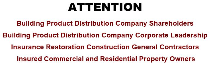 For building product distribution company investors: Although unfamiliar with the realities of the property damage insurance restoration construction market and the multi-billion dollar sales "deficits" that the building product distributors operate under, without proper due diligence, investors readily buy into the promises made by building product distribution company M&A and C-Suite leadership of great things to come as they invest billions of dollars into acquiring typically smaller but related companies. While those acquisitions may increase the size of a building products distribution company's footprint, it does nothing however to solve the problem of recapturing the billions of dollars-worth of annually missed building product sales which, when recaptured, would contribute mightily to helping the investors in those companies to achieve true maximum ROI. Until then, however...