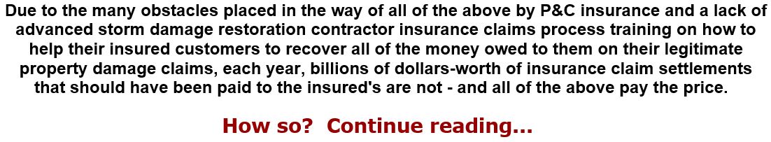 Not considering the above reality, rather than investing the relatively small amount of money needed to provide advanced training to their contractor sales force en masse which would result in a dramatic increase in sales of their building products to the ultimate buyers of those products, they instead operate under the assumption that, as long as the contractors keep ordering their products, there is no good reason to invest in getting available advanced and proven storm damage restoration process training into their hands. I suspect however, that as the institutional investors in such companies become more educated on the subject matter, they will strongly disagree.