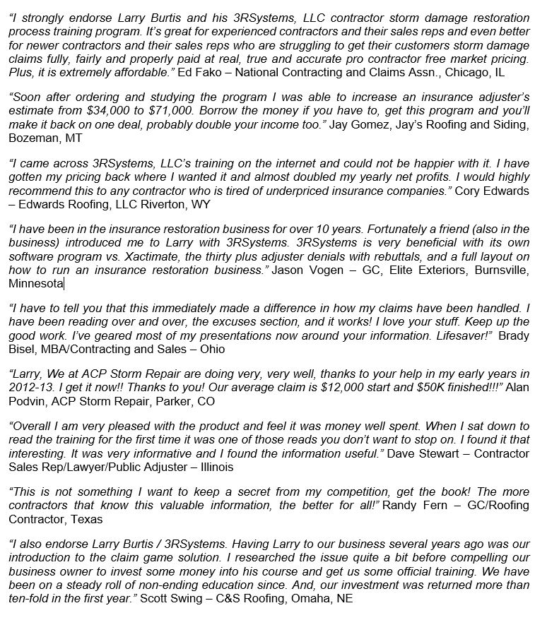 “I strongly endorse Larry Burtis and his 3RSystems, LLC contractor storm damage restoration process training program. It’s great for experienced contractors and their sales reps and even better for newer contractors and their sales reps who are struggling to get their customers storm damage claims fully, fairly and properly paid at real, true and accurate pro contractor free market pricing. Plus, it is extremely affordable.” Ed Fako – National Contracting and Claims Assn., Chicago, IL