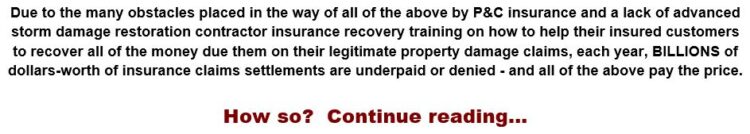 Prior to the year 2005, restoration contractors used a variety of different free market repair estimating programs to estimate the cost of repairs to their insured property owner customers damaged properties. Around 2005, the property & casualty industry introduced a repair pricing estimating program called Xactimate. Owned and controlled by the property & casualty insurance industry, they sold the program to restoration contractors as “the industry standard” repair estimating program. The biggest problem with that program however, is the fact that being owned and controlled by the property and casualty insurance industry, the repair pricing listed was and still remains below free market pricing which results in dramatic underpayments to insured property owners – in fact, billions of dollars-worth every year, as shown through the link below.