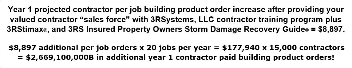 The building products distributor who makes 3RSystems, LLC restoration contractor training available to all of their restoration contractor "sales force" across the country will, as shown below, advance their company product sales to record levels, take a #1 top level position in the building products distribution industry, and achieve true maximum ROI for themselves and their investors.
